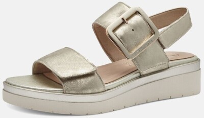 In glam gold, these smart wedge sandals from German brand Tamaris are part of their comfort range. Wide fitting, the front velcro strap and ankle buckle make them fully adjustable for a perfect fit. The 1.5 inch low wedge heel is ideal if you hate fully flat sandals.